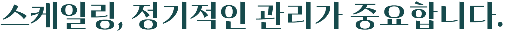 칫솔질 만으로는 제거 되지 않는 찌든 때도 있습니다. 스케일링은 착색 및 플라그와 치석을 제거하여 잇몸 염증(부종, 출혈, 통증, 기능 상실)을 치료하고 예방하는 치료입니다. 초음파를 이용하여 치아에 붙어있는 치석을 제거하며 치료 중 조금 시리거나 아플 수 있습니다.